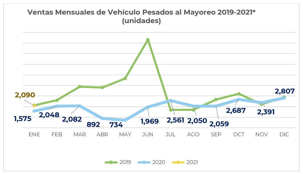 La Asociación Nacional de Productores de Autobuses, Camiones y Tractocamiones (ANPACT), informó que, durante el mes de enero, las ventas al mayoreo alcanzaron un total de 2 mil 090 unidades, que comparadas con las 1 mil 575 comercializadas durante el mismo mes de 2020, representan un incremento del 32.7%.