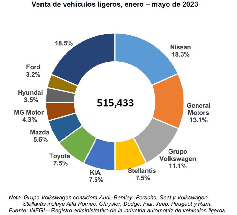 En el periodo enero-mayo de 2023 se registraron 515,433 vehículos ligeros nuevos vendidos, lo que representa un incremento de 20.4% con respecto a lo reportado durante el mismo periodo de 2022